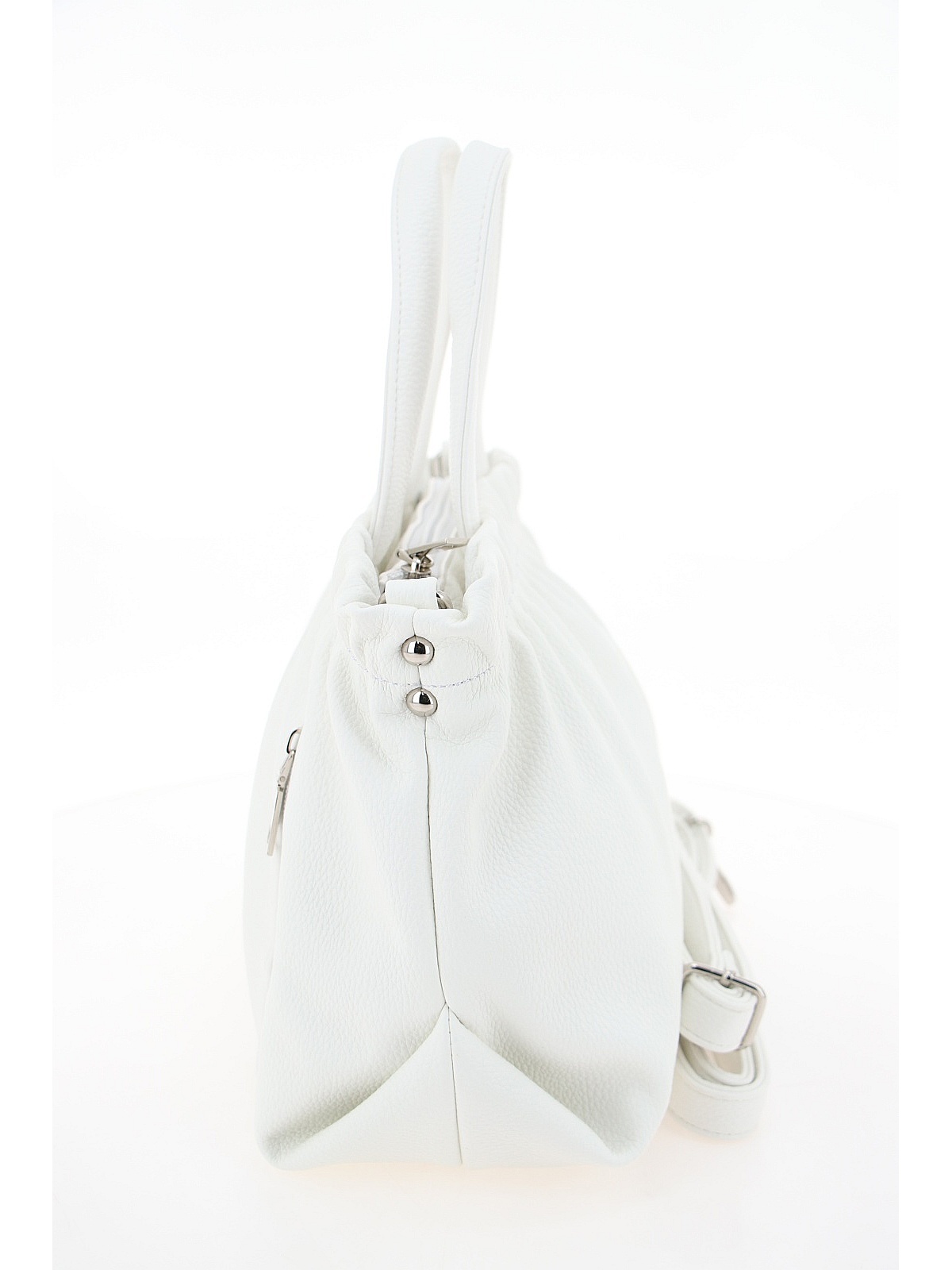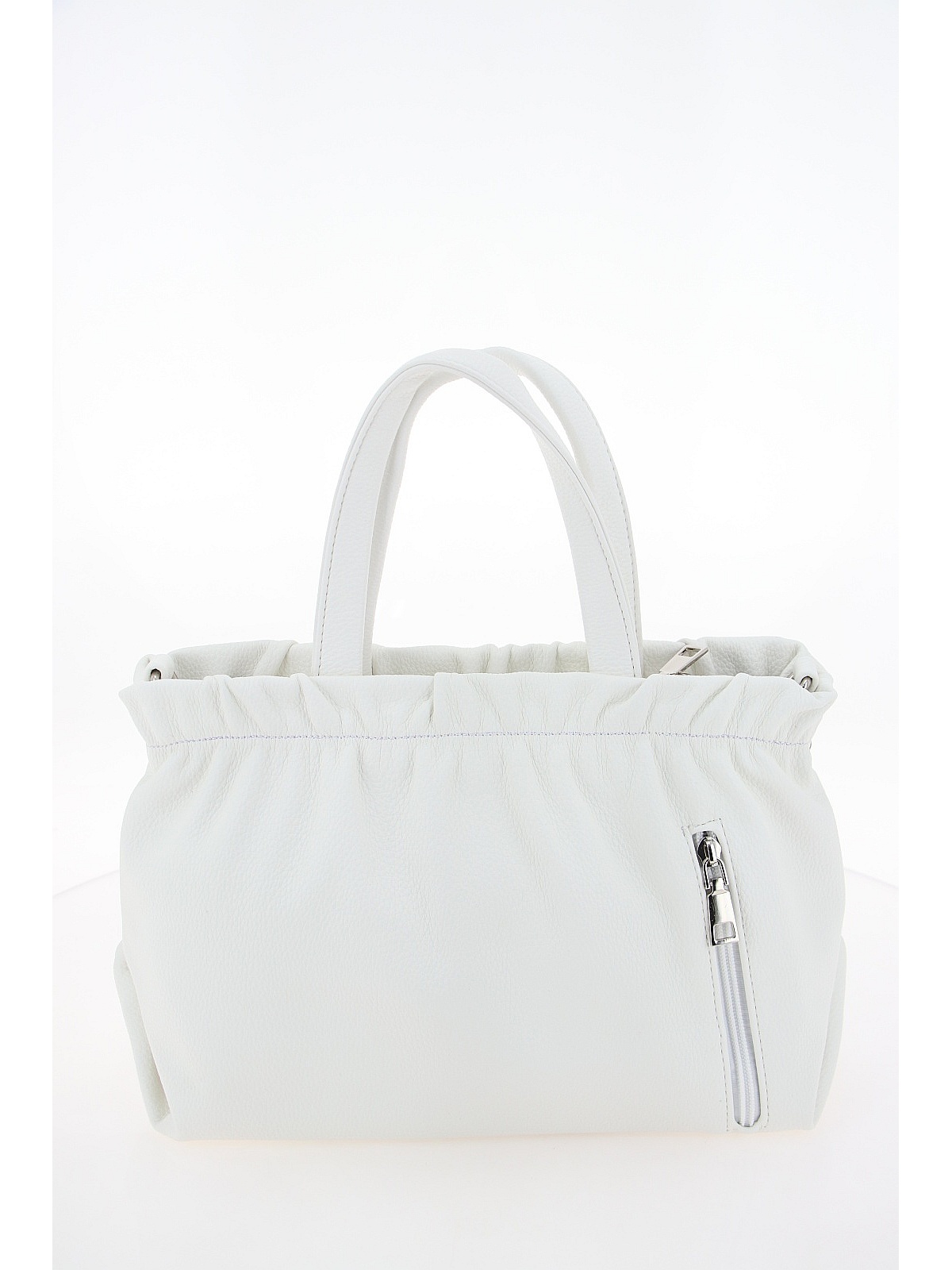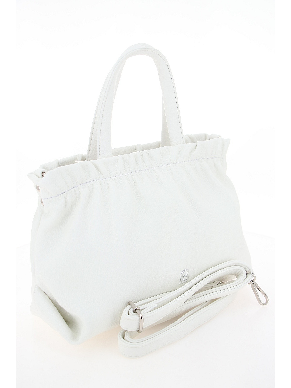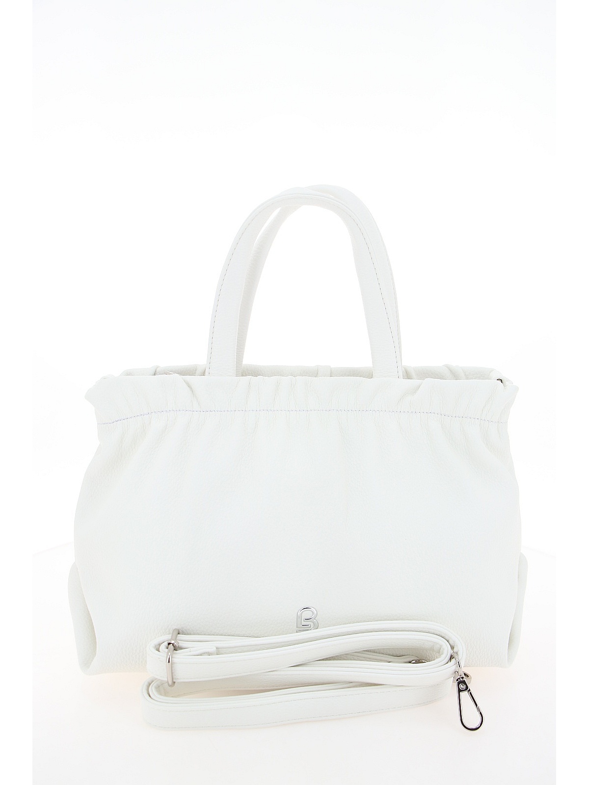 Женская сумка BADEN нежного белого цвета — вместительный и женственный аксессуар для повседневного гардероба. Модель из мягкой искусственной кожи с зернистой матовой фактурой имеет слегка трапециевидную форму. Главная особенность дизайна — эффект присборенности по верхнему краю, создающий мягкий объем. Две короткие ручки позволяют носить сумку в руках или на локте, а длинный регулируемый ремешок на карабинах добавляет универсальности для ношения на плече или через плечо. Фурнитура серебристого цвета гармонично дополняет лаконичный образ. Эта модель станет стильным дополнением ваших прогулок и повседневных образов.