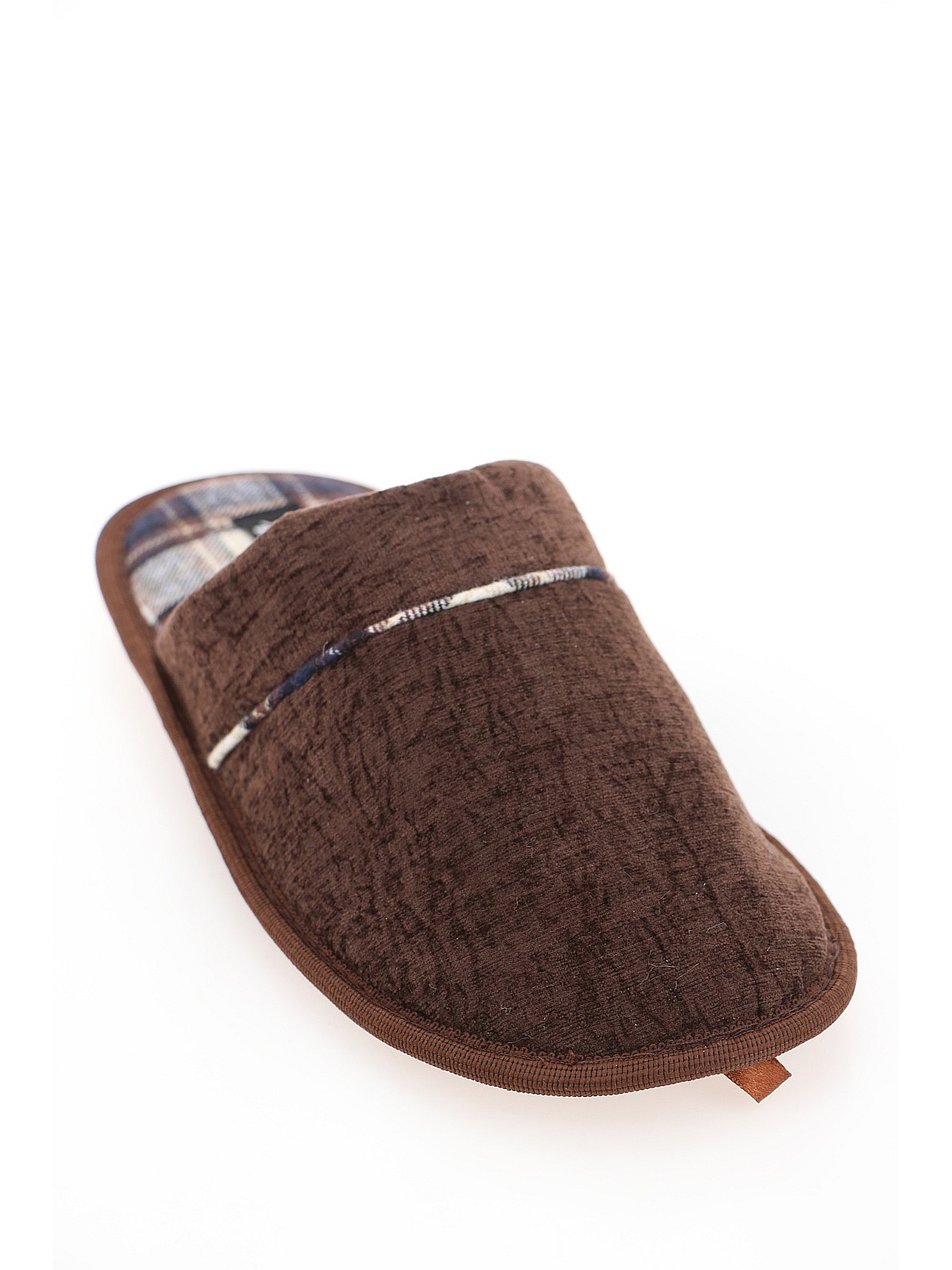 Стелька выполнена из ткани в классическую клетку в сине-бежево-коричневых тонах, что добавляет модели уюта и узнаваемого стиля. Подошва из ТЭП легкая и обеспечивает надежное сцепление с поверхностью. Благодаря продуманному дизайну и теплым материалам эти тапочки станут отличным выбором для дома.