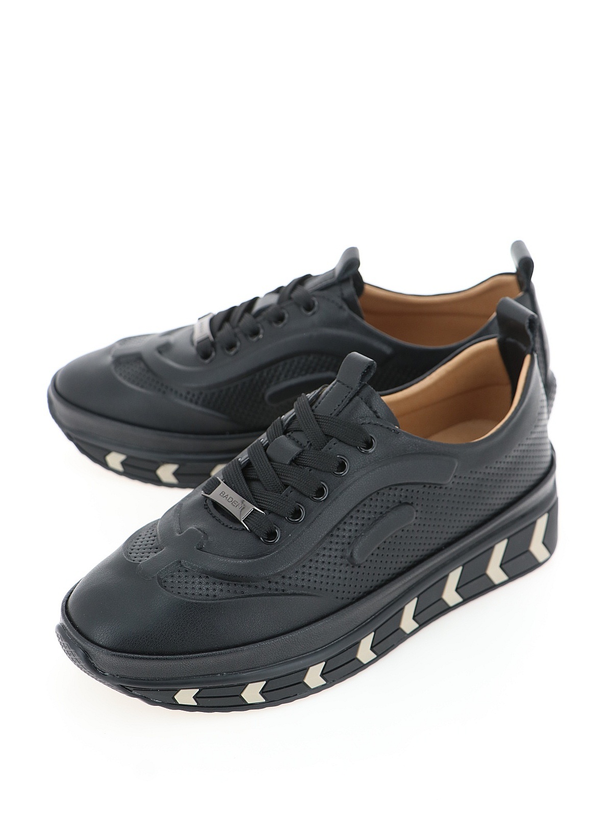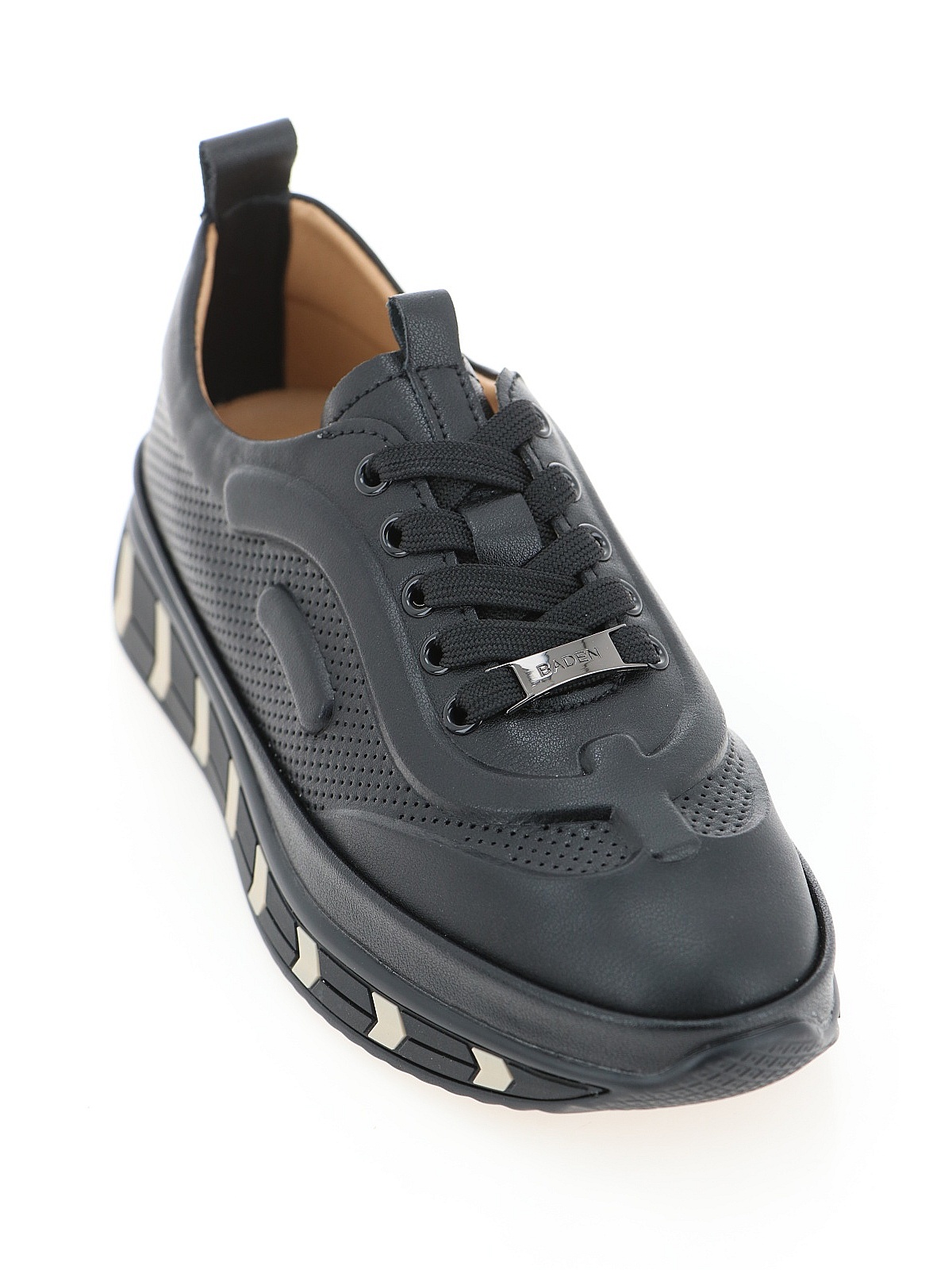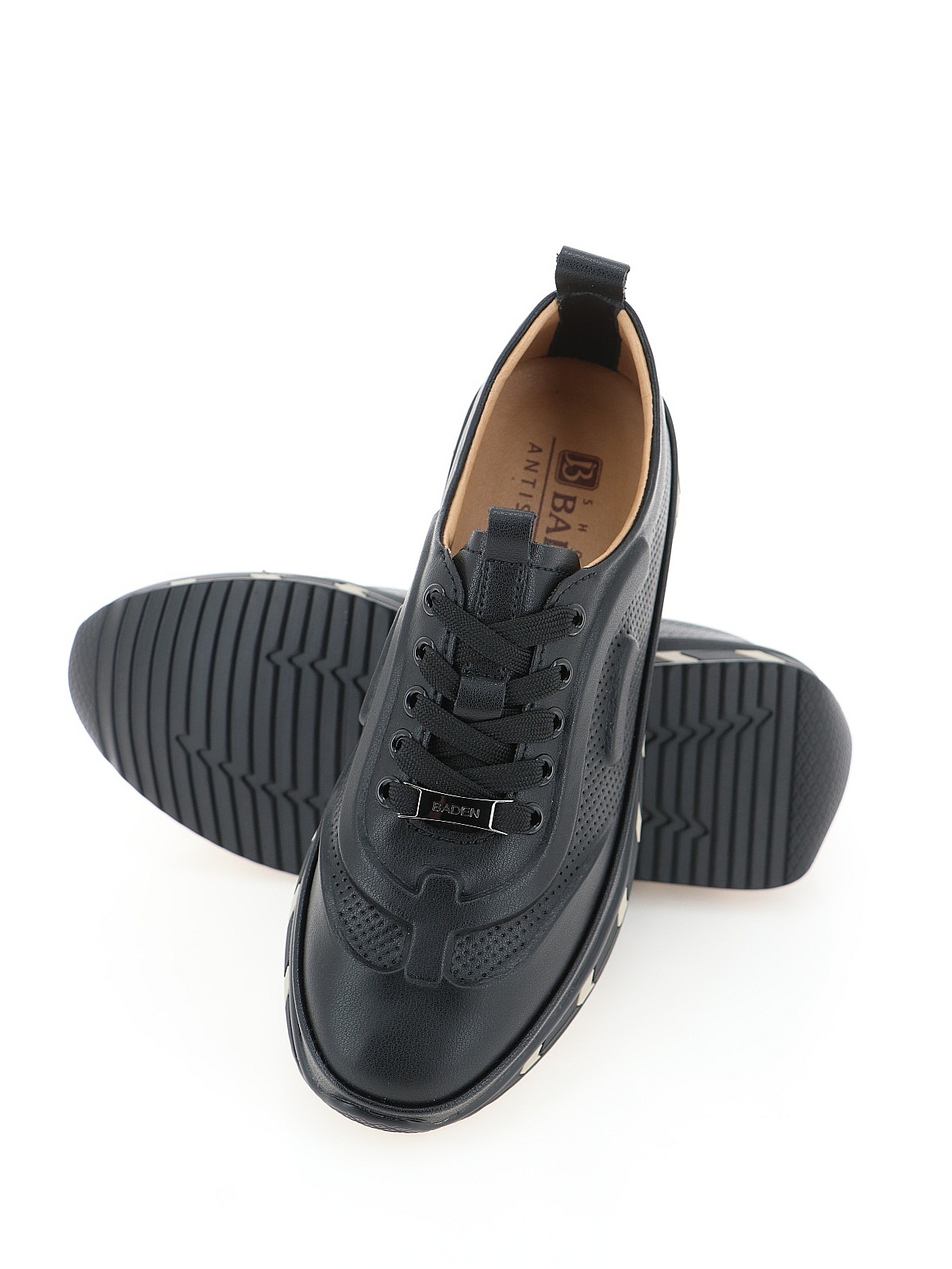 Кожаные кроссовки BADEN в черном цвете. Легкая подошва из полиуретана привлекает внимание сочетанием цветов. Шнуровка надежно фиксирует обувь на стопе, а натуральные материалы обеспечивают оптимальный микроклимат.